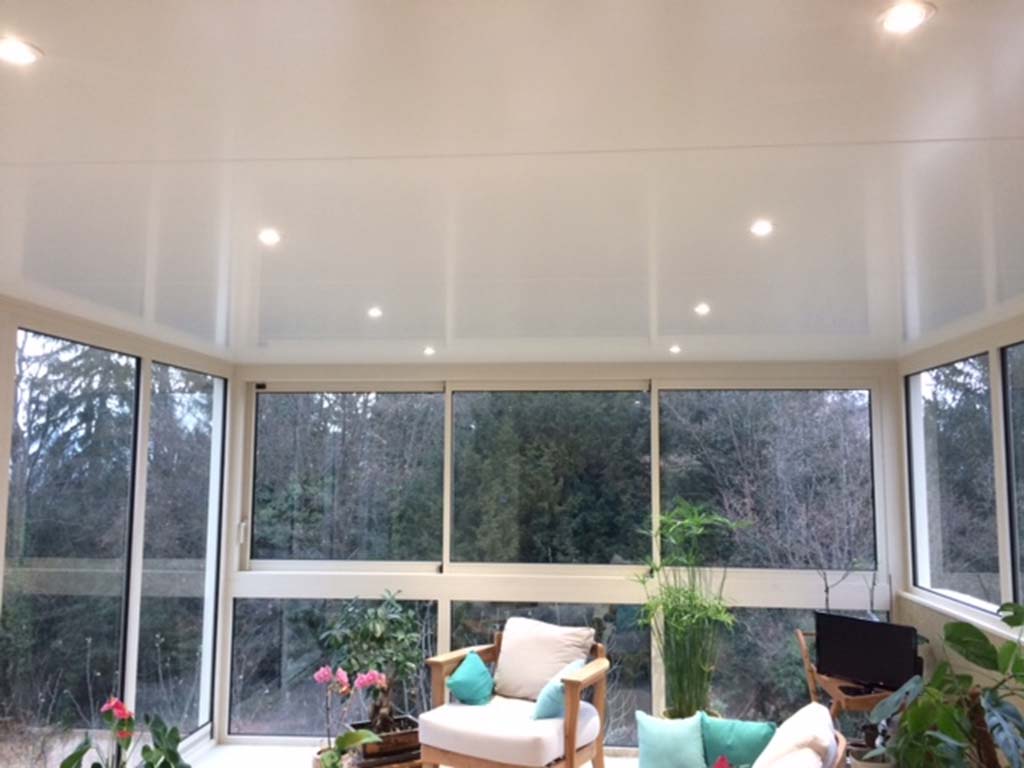 La descente des eaux pluviales est prévue par un tube PVC de 80 mm de diamètre incorporé dans la structure d’un poteau, la rendant invisible. Le chéneau est équipé de la rehausse Soft Line de veranco renforçant l'aspect esthétique de votre véranda ONYX. La toiture entièrement plate et sans chevron, est réalisée avec des panneaux sandwich isolants autoportants de 164 mm d’épaisseur vous garantissant une isolation thermique optimale. L’étanchéité est assurée par une membrane EPDM d’une seule pièce et sur mesure dont les raccords sont vulcanisés à chaud. En option vous pouvez ajouter dans le plafond, des spots d’éclairage pour une ambiance conviviale et chaleureuse.